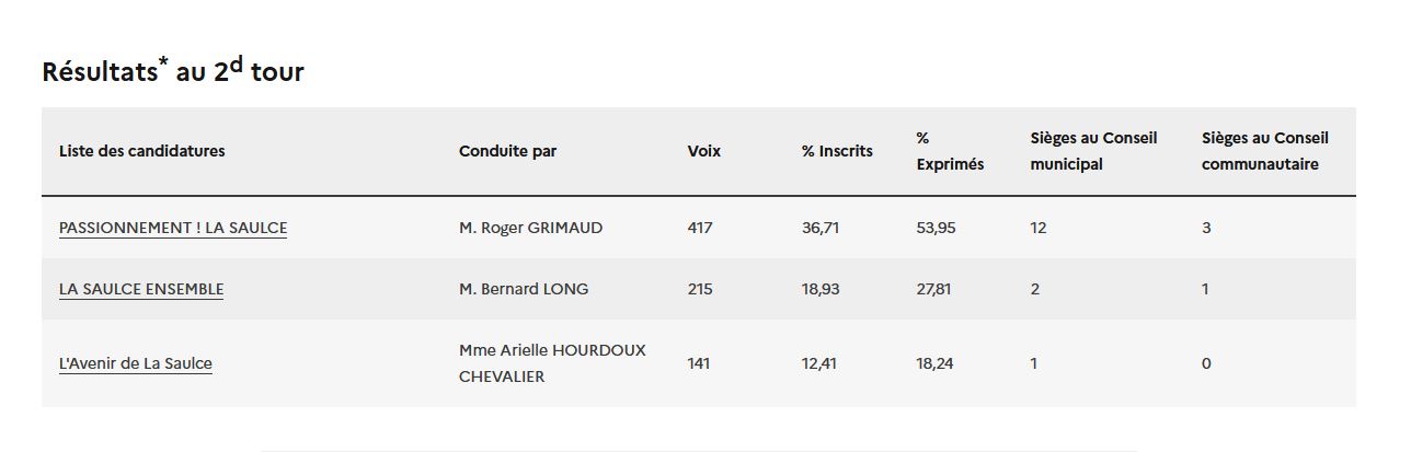 Sur la commune de La Saulce, dans les Hautes-Alpes, Roger Grimaud a été élu ce dimanche lors du second tour de ces municipales. Il devance Bernard long et Arielle Hourdoux Chevalier.