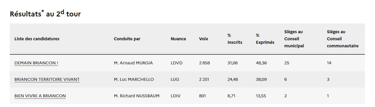 Avec plus de 48% des voix, Arnaud Murgia reste maire de Briançon. Il devance Luc Marchello, de Briançon Territoire Vivant et ses 38.09% des voix et Richard Nussbaum avec 13.55% .